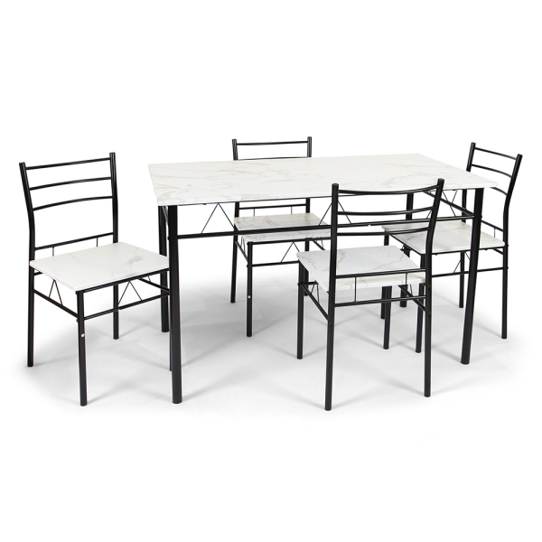 Heb je niet veel ruimte in je eetkamer of keuken, maar ben je toch op zoek naar een leuke tafel met stoelen? Dan raden we de Milton & Oldbrook eetkamerset Valencia aan. Deze compacte eetkamer set is een 5-delige set met een eettafel en 4 eetkamerstoelen. De tafel heeft een rechthoekig tafelblad met een mooie marmerlook. De stoelen hebben een marmerlook zitting. De eettafel en eetkamerstoelen hebben een structuur van metaal, en een zitting en blad gemaakt van MDF. De witte Valencia eethoek set is ideaal voor kleine keukens, ontbijthoeken of kleine eetkamers.