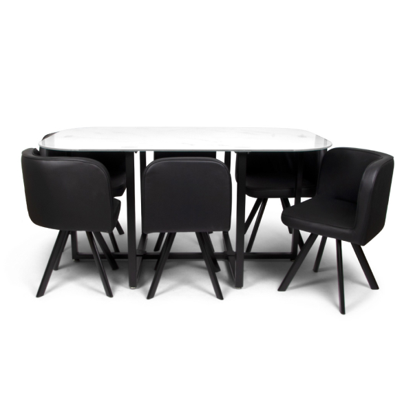 Met de witte marmeren Sofia set van Milton & Oldbrook kan je gezellig tafelen met vrienden of familie. De 7-delige eetkamer set bestaat uit een witte eettafel van 150 cm en zes stoelen. De eettafel heeft afgeronde hoeken en de zwarte stoelen hebben een uniek en comfortabel ontwerp. De marmeren tafel is gemaakt van gehard glas en metaal, en de stoelen zijn vervaardigd uit polyester en metaal. De Sofia set heeft een praktisch, compact formaat, perfect voor kleine keukens, ontbijthoeken of compacte eetkamers. Dankzij de neutrale kleuren past deze ruimtebesparende eethoekset moeiteloos in diverse interieurs.
