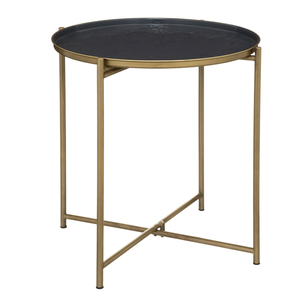 De Florian bijzettafel van Eazy Living zorgt voor een stijlvolle toets in jouw interieur. Het ronde tafeltje is gemaakt van ijzer, en bestaat uit een goudgelakt frame en een donkergrijs tafelblad met print. Het ijzeren tafeltje zorgt dankzij de combinatie van goud en donkergrijs voor een luxueus tintje, en staat leuk naast een fauteuil of zetel. Het handige aan de Florian bijzettafel is dat je het tafeltje na gebruik kan inklappen. Je kan het tafelblad van het frame nemen, en het frame inklappen. De Eazy Living bijzettafel heeft een diameter van 43 cm en een hoogte van 51 cm.