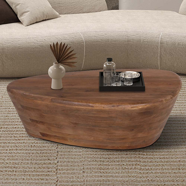 Breng warmte in je woonkamer met de Eleta salontafel, een echte blikvanger met een natuurlijk karakter. Deze asymmetrische salontafel van Stozy is gemaakt van massief mangohout en straalt vakmanschap uit. De natuurlijke houtnerf en warme kleurschakeringen zorgen voor een uitnodigende sfeer. Of je nu je kopje koffie kwijt wilt, decoratie uitstalt of gasten ontvangt, de Eleta salontafel is een stijlvolle en praktische keuze voor elk interieur.