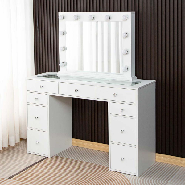 - Hollywood-spiegel met verlichting: De grote spiegel is rondom voorzien van lampen, zodat je altijd in helder, gelijkmatig licht je make-up kunt aanbrengen, perfect voor elke look.