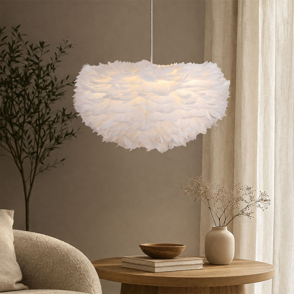 - Zachte en warme lichtbeleving: De verenstructuur filtert het licht op een natuurlijke manier, waardoor een aangename en rustgevende ambiance ontstaat.