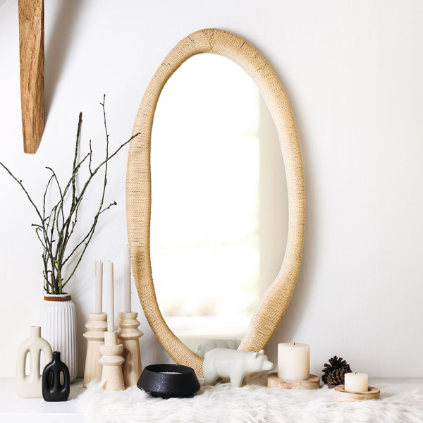 Met de Piaf wandspiegel van Eazy Living zorg je voor meer charme en natuur in huis. De Piaf wandspiegel heeft een prachtige, asymmetrische vorm en is versierd met gevlochten touw. De combinatie van de unieke vorm en het touw zorgt ervoor dat de spiegel een echte blikvanger is voor in elke ruimte. De wandspiegel is gemaakt van touw, MDF en glas, en kan je horizontaal of verticaal monteren tegen de muur. Je kan de organische wandspiegel combineren met andere houten decoratie of gevlochten decoratie om het natuurlijke element meer naar boven te brengen in je interieur. De Eazy Living wandspiegel heeft een afmeting van 58 cm op 114 cm, en is 5 cm dik.