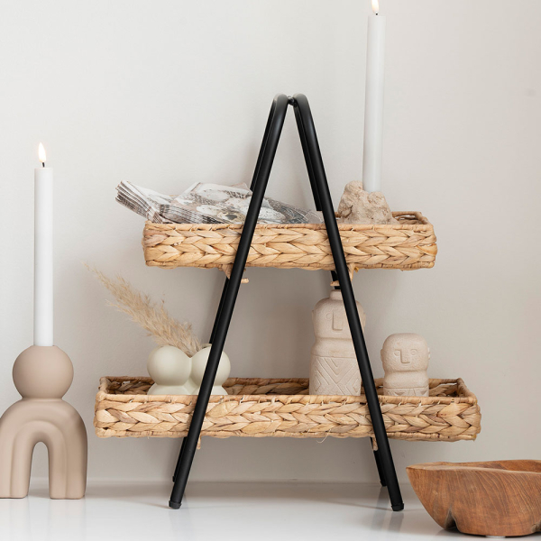 Het Ulf mandenrekje van House Collection zorgt voor een natuurlijke toets in jouw interieur. Het mandenrekje heeft twee mandjes van gevlochten waterhyacint, en de mandjes hangen in een metalen frame. Je kan het gevlochten mandenrekje in verschillende woonstijlen plaatsen en makkelijk combineren met andere meubels en decoratie. Om het gevlochten element wat naar boven te brengen kan je het mandenrekje combineren met een gevlochten spiegel of gevlochten opbergmanden. Het mandenrek heeft een breedte van 42 cm, een diepte van 23 cm een hoogte van 43,5 cm.