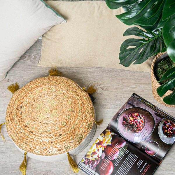 Het Yara vloerkussen van Eazy Living zorgt voor een natuurlijke en sfeervolle toets in je interieur. Het decoratieve vloerkussen heeft een jute bovenkant en is afgewerkt met gouden franjes aan de zijkant. Het ronde vloerkussen heeft een diameter van 38 cm en is ongeveer 10 cm dik. Het beige vloerkussen Yara staat mooi in verschillende interieurs, en vindt zeker een plaatsje in een botanisch interieur, een bohemien interieur of een beach interieur.