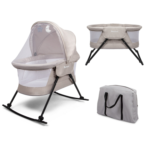 Die Baninni 3-in-1-Babywiege Adora sorgt für sanfte Träume und guten Schlaf. Die Babywiege hat 2 Positionen, eine Wiegeposition und eine Schaukelposition. Sie können die Positionen leicht wechseln, indem Sie die Unterschenkel ein- und ausklappen. Die sandfarbene Schaukelwiege verfügt über ein abnehmbares Verdeck mit Netzstoff und Spielzeug, einen stabilen, leichten Rahmen sowie eine Vorder- und Rückseite aus Netzstoff. Dank des Netzes kann die Luft gut zirkulieren und Sie können Ihr Baby gut im Auge behalten. Mit der Tragetasche können Sie die Adora einfach mitnehmen und als Reisewiege verwenden. Die multifunktionale Babywiege von Baninni lässt sich leicht zusammenbauen und kann von der Geburt bis zu 6 Monaten (max. 9 kg) verwendet werden.