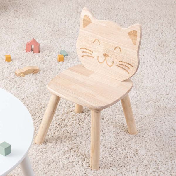 Der Chat-Kinderstuhl von Eazy Living ist ein Holzstuhl in Kindergröße. Der Holzkinderstuhl ist aus Gummibaumholz gefertigt und hat niedliche Details. Zum Beispiel hat der Kinderstuhl eine Rückenlehne mit einem Katzenkopf auf der Vorderseite und einem Katzenschwanz auf der Rückseite. Der Katzenkinderstuhl verleiht dem Kinderzimmer oder Spielzimmer einen lustigen Touch und kann mit verschiedenen Kindertischen und Kinderstühlen kombiniert werden. Der Kinderstuhl hat eine Sitzhöhe von 26 cm.