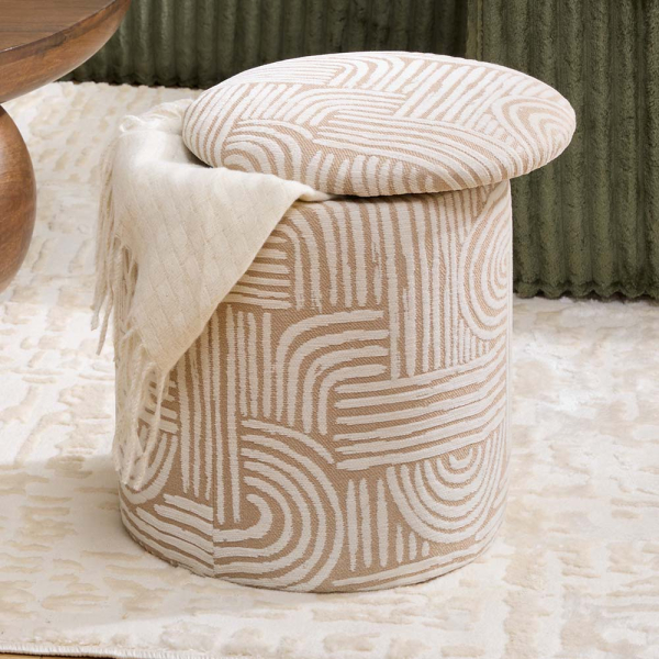 Der Eazy Living Pouf Arietty ist eine stilvolle 2-in-1-Lösung, die Komfort und Stauraum perfekt in einem trendigen Design vereint. Der runde Aufbewahrungspouf dient sowohl als zusätzliche Sitzgelegenheit als auch als praktische Aufbewahrungsbox – ideal, um Plaids, Kissen oder andere Gegenstände ordentlich außer Sicht zu verstauen. Dank des verspielten Musters mit geraden und geschwungenen Linien sowie der sanften beigen Farbe fügt sich der Arietty mühelos in jedes moderne Interieur ein.