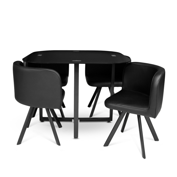Mit dem schwarzen Esszimmer-Set Sofia von Milton & Oldbrook können Sie ein gemütliches Abendessen mit Freunden oder der Familie genießen. Das schwarze 5-teilige Esszimmer-Set besteht aus einem quadratischen 100-cm-Esstisch und 4 Stühlen. Der Esstisch hat abgerundete Ecken und die Stühle haben ein einzigartiges und bequemes Design. Der Tisch ist aus gehärtetem Glas und Metall, die Stühle sind aus Polyester und Metall gefertigt. Das Sofia Esstischset hat eine praktische, kompakte Größe, perfekt für kleine Küchen, Frühstücksecken oder kleine Esszimmer. Dank seiner schwarzen Farbe können Sie das platzsparende Esszimmerset in vielen Räumen aufstellen.