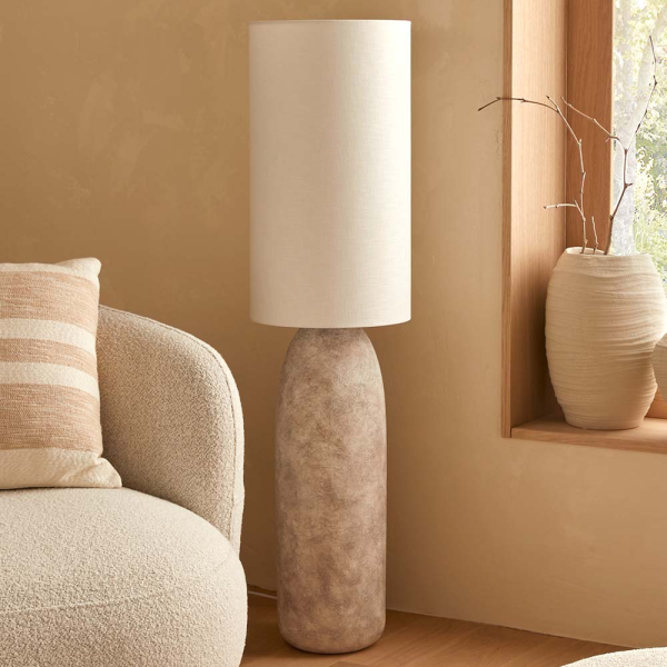 Eine elegante Blickfang für jedes Interieur: die Maline Designlampe von Eazy Living. Die besonderen Proportionen der Lampe mit einem schlanken Schirm und einem keramischen Fuß sorgen für einen stilvollen Kontrast. Ideal als Statement-Piece in einer Zimmerecke oder neben einem Sessel.