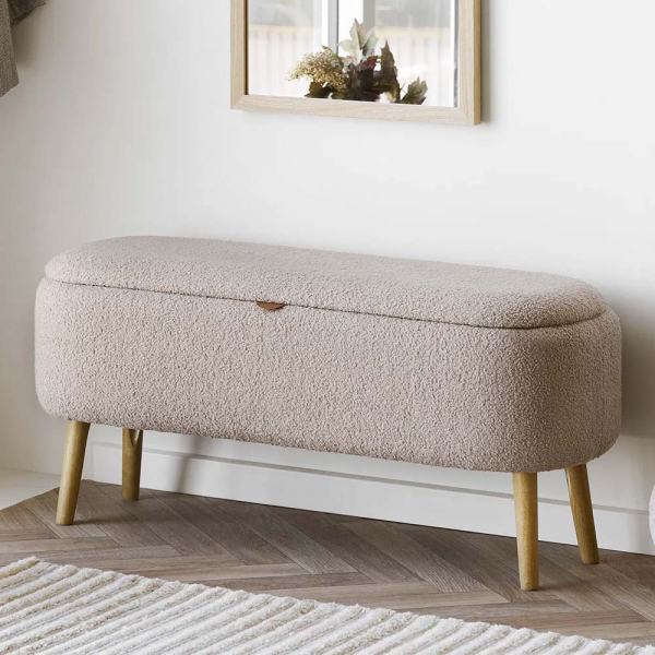 Der House Collection Hocker Tova hebt Ihr Interieur auf ein neues Niveau. Die subtile Bank kombiniert einen weichen Bouclé-Bezug in warmem Beigeton mit cleveren Aufbewahrungsmöglichkeiten. Dank der großzügigen Maße bietet Tova ausreichend Sitzfläche, ohne zu massiv zu wirken – perfekt für Flur, Wohnzimmer oder Schlafzimmer. Unter der Sitzfläche befindet sich ein verstecktes Fach, ideal für Kissen, Plaids oder andere Dinge, die Sie außer Sicht aufbewahren möchten.