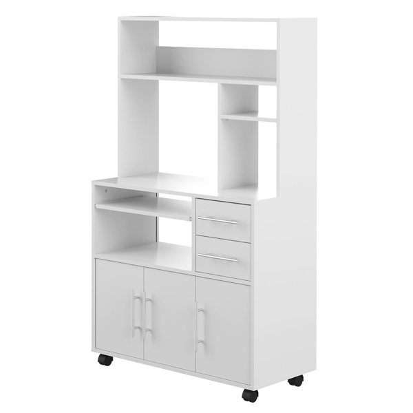 Der Küche Wagen Ellera von Interia ist eine elegante Lösung zusätzliche Speicher in Ihrer Küche. Moderne Speichereinheit verschiedene Speicheroptionen bietet, weil es von 3 Türen mit einem verstellbaren Boden besteht , 2 Schubladen mehr offene Fächer . So können Sie eine Mikrowelle oder Kaffee im Hauptfach platzieren, und Sie können den anderen Stauraum für Töpfe, Pfannen, Besteck, Becher und anderes Geschirr verwenden. Weiß Wagen hat ein einfache und modernes Design und ist aus Spanplatten mit weiß .
