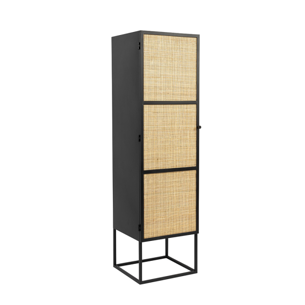 Der schwarze MDF-Wandschrank Floor von Nesthaus hat dank der Rattantüren einen modernen Look. Im Inneren des Schranks befinden sich 2 Einlegeböden und der Rahmen ist aus pulverbeschichtetem Eisen, wodurch der Schrank in viele Innenräume passt. Weil er so schmal ist, nimmt er nicht viel Platz ein, aber man kann viel hineinpacken. Der Floor schrank eignet sich hervorragend zur Aufbewahrung von Büchern, Spielzeug oder dekorativen Wohnaccessoires wie Plaids. Kombinieren Sie diesen Schrank mit einem anderen Schrank oder einer Anrichte aus der gleichen Kollektion und vervollständigen Sie Ihre Einrichtung.