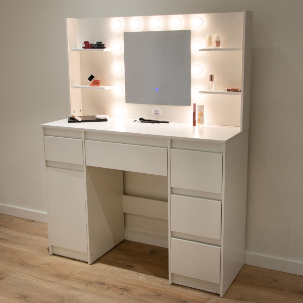 Gestalten Sie Ihre morgendliche Routine neu mit dem Milton & Oldbrook Schminktisch Nora. Dieser moderne Schminktisch mit Spiegel und LED-Beleuchtung ist ein Muss für jeden Beauty-Liebhaber. Die helle LED-Beleuchtung rund um den Spiegel ermöglicht es Ihnen, jedes Detail Ihres Make-ups zu sehen und sorgt für ein professionelles Finish. Die geräumigen Schubladen und offenen Fächer bieten reichlich Platz für all Ihre Kosmetika, Accessoires und Stylingtools. Perfekt für das Schlafzimmer, das Ankleidezimmer oder den Beauty Room!