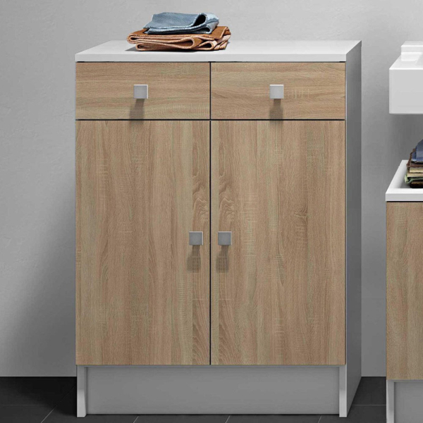 Der Badezimmerschrank Luna von Interia ist eine praktische Ergänzung für Ihr Badezimmer, Ihre Waschküche oder Ihren Abstellraum. Der Schrank ist aus Spanplatten gefertigt und hat 2 Schubladen und 2 Türen. Auf den eiche-weißen Badezimmerschrank können Sie schöne Wohnaccessoires wie Kerzen oder eine Pflanze stellen. In den Schubladen und Türen können Sie Handtücher, Waschmittel, Pflegeprodukte oder andere Dinge verstauen. Der Interia Badezimmerschrank hat ein kompaktes und modernes Design und sorgt für Ordnung in Ihrem Badezimmer!