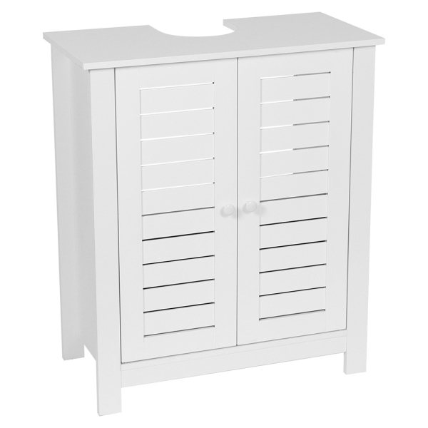 Schaffen Sie ein ordentliches und stilvolles Badezimmer mit dem Waschbeckenunterschrank Guus – funktionales Design für maximale Platzausnutzung! Dieser weiße Unterschrank aus MDF wurde speziell für den Bereich unter dem Waschbecken entworfen. Die clevere Aussparung an der Oberseite sorgt für eine perfekte Passform um den Siphon, während zwei Türen und ein Innenboden praktischen Stauraum für Ihre Badutensilien bieten.