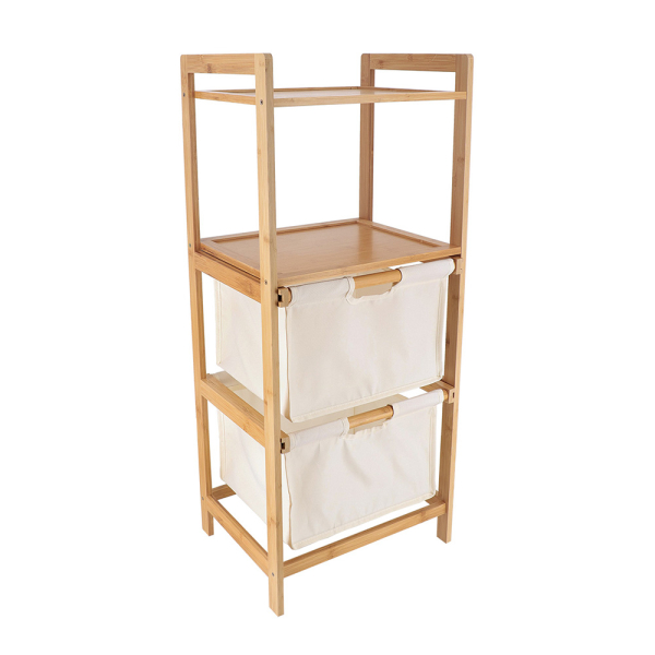 Das Badregal Ella von Lamento ist ein praktischer Organizer für das Badezimmer. Denn das Badregal hat 3 Ebenen, von denen 2 mit einem beigen Korb ausgestattet sind. Das Badregal ist aus Bambus gefertigt, einer Holzart, die sich perfekt für feuchte Räume eignet. Die Körbe sind aus Polyester gefertigt. Verwenden Sie das Ella-Regal zur Aufbewahrung von Badaccessoires und Handtüchern, und stellen Sie eventuell eine schöne Pflanze darauf. Das Badregal Lamento hat eine Breite von 38 cm, eine Tiefe von 30 cm und eine Höhe von 90 cm.