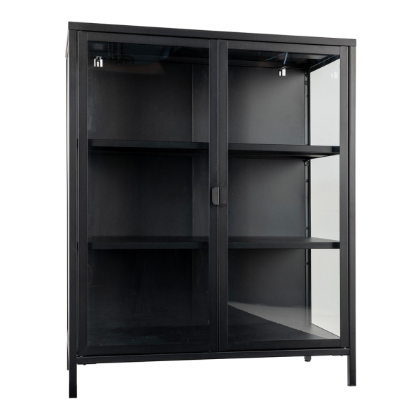 Die Bori-Vitrine von House Collection ist aus schwarzem, mattem Stahl gefertigt und hat daher einen robusten Look. Der niedrige Metallschrank ist mit 3 Einlegeböden ausgestattet und hat 2 Glastüren. Die Seitenwände sind ebenfalls aus Glas und verleihen dem Schrank ein geräumiges Aussehen. Ideal für die Präsentation von Gläsern, Geschirr oder Erinnerungsstücken.