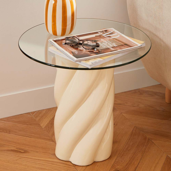 Vervollständigen Sie Ihr Interieur und verleihen Sie ihm einen exklusiven, zeitgenössischen Look mit dem Clovis Beistelltisch von Eazy Living. Dieser beigefarbene Beistelltisch kombiniert eine Glasplatte mit einem künstlerisch gedrehten Fuß. Das Ergebnis ist ein raffiniertes Möbelstück, das nicht nur funktional ist, sondern auch in jedem Wohnraum ein echtes Statement setzt.