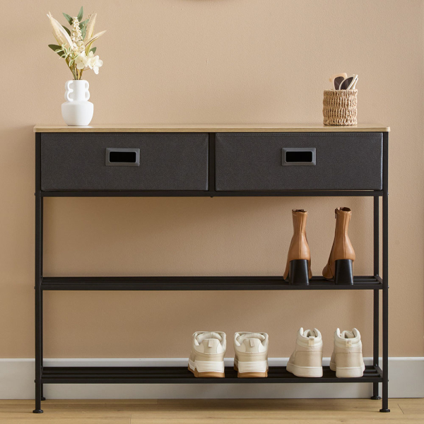 - Praktischer Stauraum: Ausgestattet mit zwei Stoffschubladen und mehreren offenen Ablagen für Schuhe, Körbe oder Wohnaccessoires.
