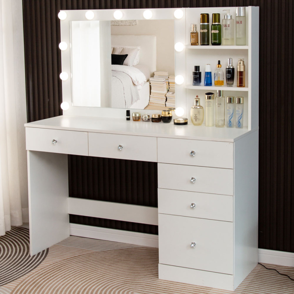 - Stilvolles und zeitloses Design: Die weiße Oberfläche, klare Linien und Hollywood-Beleuchtung machen diesen Schminktisch zu einem echten Blickfang.