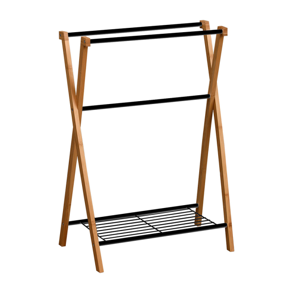 Mit dem praktischen Handtuchhalter Manon können Sie Ihre gebrauchten Handtücher einfach aufbewahren. Der Handtuchhalter Manon ist ein praktischer Ständer mit 3 Hängearmen und einer Ablage am Boden. So haben Sie genügend Platz für ein paar Handtücher und Waschlappen. Neben dem Handtuchhalter können Sie den Ständer auch als Kleiderständer verwenden. Der schwarze Handtuchhalter ist aus Metall und Bambus gefertigt und sieht in verschiedenen Badezimmern gut aus. Der Handtuchhalter Manon hat eine Breite von 60,5 cm, eine Tiefe von 37 cm und eine Höhe von 86 cm.