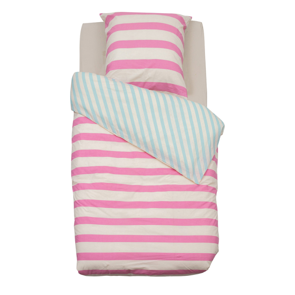 Ajoutez de la couleur à votre chambre d'enfant avec la housse de couette Rayures d'Eazy Living ! L'ensemble de literie Rayures se compose d'une housse de couette simple (140 x 200 cm) et d'une taie d'oreiller assortie (65 x 65 cm). La housse de couette de la collection pour enfants est en coton, ce qui la rend agréable, douce et légère. Elle présente un imprimé à rayures rose/blanc d'un côté et un imprimé à rayures bleu/blanc de l'autre.