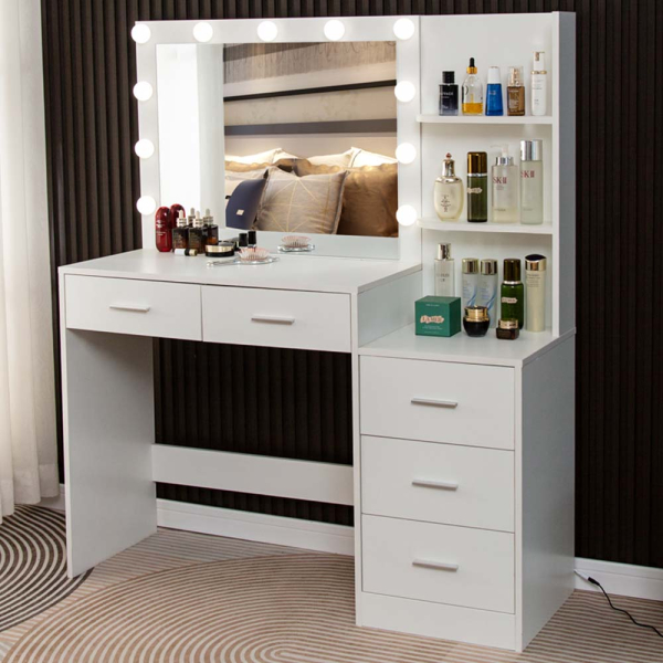 - Espace de rangement pratique : Équipée de 5 tiroirs et d’une étagère ouverte avec 2 niveaux sur le côté, idéale pour ranger soigneusement maquillage, produits de soin et accessoires.