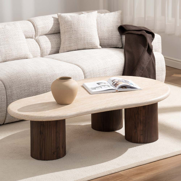 - Plateau en effet travertin : La forme organique du plateau apporte une touche naturelle et s’harmonise facilement avec différents styles d’intérieur.