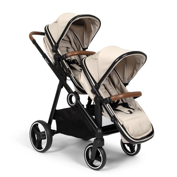 In de zandkleurige Luiz duo kinderwagen van Baninni kan je jouw kindjes overal mee naartoe nemen. Deze praktische kinderwagen is verstelbaar op allerlei manieren zodat de kleintje steeds in de meest comfortabele positie kunnen mee reizen. Elk zitje kan afzonderlijk versteld worden. Bovendien kan deze Baninni kinderwagen ook als enkele wandelwagen gebruikt worden. De ziteenheden kunnen omgevormd worden tot reiswiegen zodat je kindjes ook kunnen slapen in de buggy. Ook kunnen ze tegenover mekaar gezet worden en kunnen je kindjes elkaar zien. De met kunstleer afgewerkte duwbeugel is in hoogte verstelbaar en de zwenkwielen zorgen voor vlotte bewegingen. De Luiz is geschikt als tweeling buggy of duo buggy voor een baby en een peuter (0 tot 36 maanden, max. 22 kg/zitje).