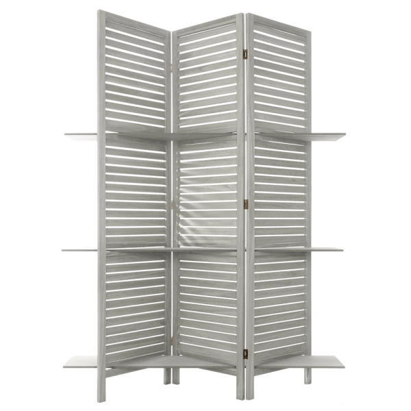 Met dit klassieke vouwscherm met houten latjes van Eazy Living creëer je meer privacy, kan je de ruimte opdelen en breng je een echte sfeermaker in huis. Het houten kamerscherm is bovendien voorzien van verschillende opbergplankjes waarop je decoratieve items of woonaccessoires kunt plaatsen. Dankzij het klassieke design met houten latjes krijgt je woning ook meteen een Zuiders karakter. De grijze paravent is gemaakt van Paulowniahout, een lichte en tegelijk stevige houtsoort, en heeft 3 panelen van elk 40 cm breed. De totale hoogte bedraagt 170 cm.