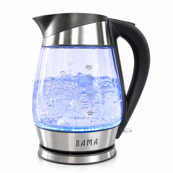 Dankzij de Bama waterkoker Rica kan je in een korte tijd genieten van een tasje thee of koffie. De Rica waterkoker heeft een compact formaat met een capaciteit van 1,7 liter. De glazen waterkoker met RSV details is snoerloos afneembaar en kan 360° gedraaid worden. Dit zorgt ervoor dat zowel rechts- als linkshandigen de waterkoker makkelijk kunnen gebruiken. Je kan het deksel openen met de drukknop en met de waterniveau indicatie kan je zien hoeveel water je in de schenkkan doet. Wanneer het water aan het koken is, gaat de ledverlichting onderaan de glazen schenkkan aan. Wanneer het water klaar is met koken, gaat de verlichting uit en schakelt de waterkoker automatisch uit dankzij de droogkookbeveiliging. De waterkoker kan ook handmatig uitgeschakeld worden. De Bama waterkoker is voorzien van een handig snoeroprolsysteem. De antislipvoetjes houden de waterkoker veilig op zijn plaats. De Rica waterkoker heeft onderaan een diameter van 13,5 cm.