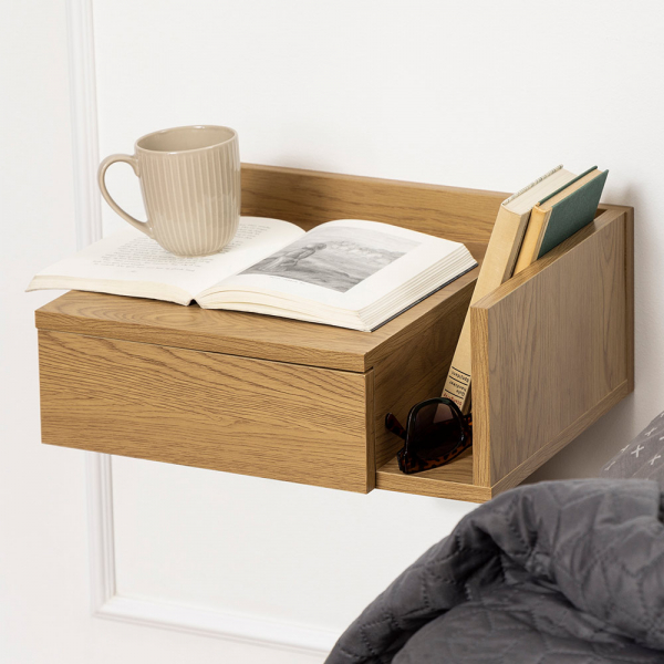 Ken je het gevoel dat je nachtkastje net te laag is voor naast je bed? Dan is dit Aydin nachtkastje van Smuk de ideale oplossing. Met dit houten nachtkastje kan je zelf kiezen op welke hoogte je het kastje wilt hangen. Zo is het kastje nooit te laag of te hoog. Het zwevend nachtkastje is gemaakt van MDF en is uitgerust met 1 lade en aan de linkerkant met 1 opbergvak. Het opbergvak kan tijdens de montage ook aan de rechterkant geplaatst worden. Je kan het Smuk kastje met maximum 20 kg beladen. Zo is de Aydin stevig genoeg voor een nachtlampje, een klok, een boek en wat decoratie. Het houten kastje heeft een breedte van 40 cm, een diepte van 32 cm en een hoogte van 16,5 cm.