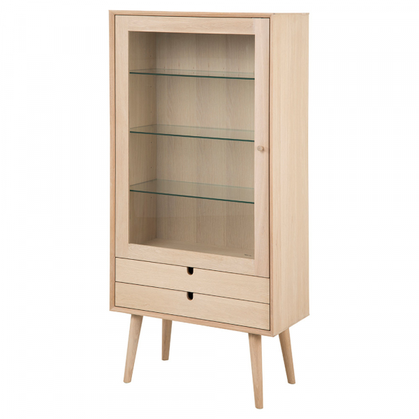 De Celaena vitrine van Smuk zorgt voor een warme toets in jouw interieur. De eiken vitrinekast is gemaakt van eik en eikenfineer, en heeft 1 glazen deur. De Celaena kast heeft naast 1 deur ook 2 lades onderaan. Achter de glazen deuren heb je 3 glazen legplanken, en samen met de lades heb je in totaal 6 niveaus. Dankzij het stijlvolle ontwerp en de mooie houtkleur staat deze vitrinekast mooi in verschillende interieurstijlen. De Calaena vitrinekast is een veelzijdige kast die je in je woonkamer, kantoor, eetkamer en hal kan plaatsen. De eiken vitrinekast heeft een breedte van 72 cm, een diepte van 36 cm en een hoogte van 143 cm.