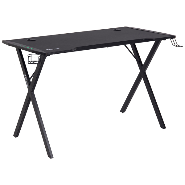 Ga voor een praktische en stijlvolle gaming set-up met de Reagan game bureau van Smuk. De zwarte gamebureau heeft een krasbestendig tafelblad gemaakt van carbon en melamine, en staat op een stevig, gepoedercoat metalen onderstel. Deze gaming desk zorgt voor een praktische set-up dankzij de handige koptelefoonhouder, bekerhouder en de kabelopeningen. Daarnaast is de computertafel ook voorzien van ledverlichting, wat voor een leuke sfeer zorgt tijdens het gamen. De Reagan gaming bureau heeft een lengte van 120 cm, een breedte van 60 cm en een hoogte van 75 cm.