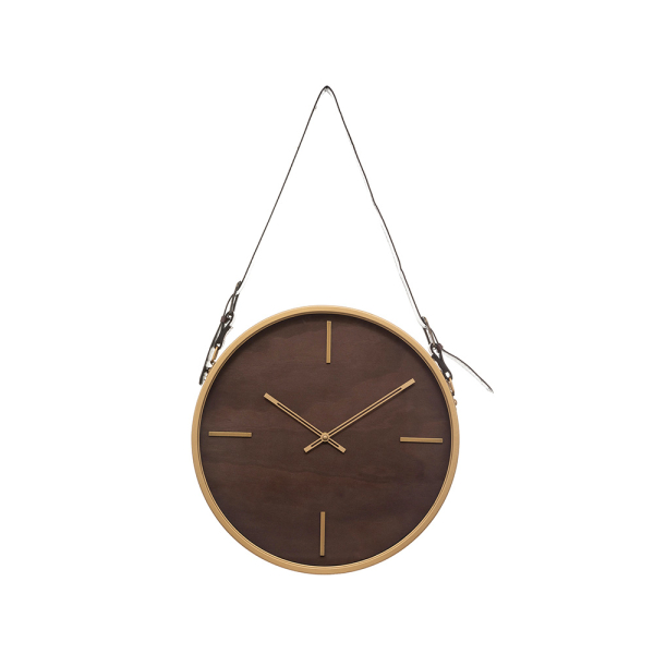 De wandklok Delaney van Eazy Living past bij ieder interieur omdat hij geen cijfers op de wijzerplaat heeft. Hij valt ook meteen op aan de muur door de riem en bruine kleur. De wandklok is gemaakt van MDF. Rondom het glas heb je een gouden rand, wat voor een mooi contrast zorgt. De tijd wordt ook aangegeven met gouden wijzers.